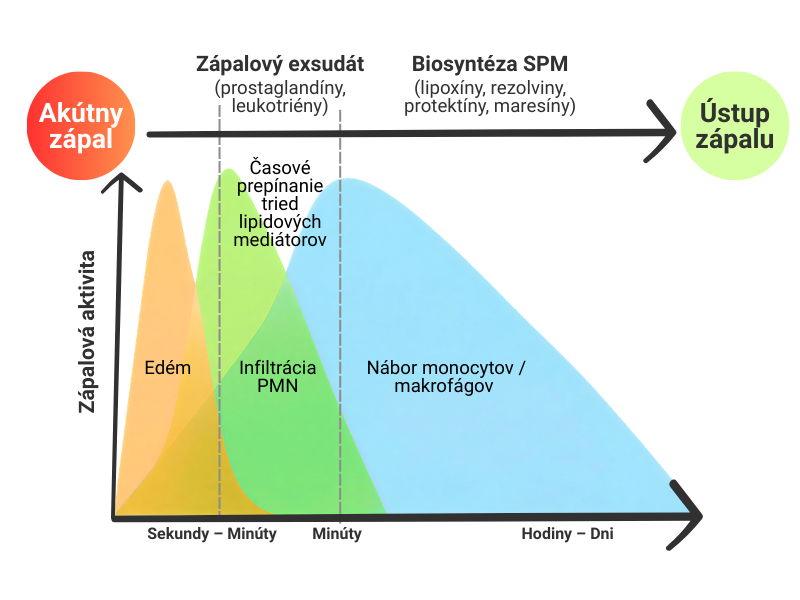 scale.png 200.55 KBObrázok 1. Akútny zápal a jeho ideálny výsledok – úplné vyliečenie. Prechod od syntézy zápalových mediátorov (prostaglandíny, leukotriény) na SPM iniciuje aktívne vymiznutie zápalu. Sú znázornené fázy priebehu akútneho zápalu: opuch, infiltrácia polymorfonukleárnymi leukocytmi (PMN), pritiahnutie monocytov-makrofágov do zápalového exsudátu. Zníženie počtu PMN sa zhoduje s výskytom SPM v exsudáte – biosyntézou lipoxínov, rezolvinov, protektínov a marezínov pri resorbcii exsudátu [upravené podľa Serhan CN, 2018].