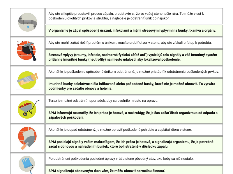 Pozrime sa na zápalovú reakciu a úlohu SPM pri jej riešení na príklade z bežného života s netesnou rúrkou v stene (pozri tabuľku s obrázkami nižšie).