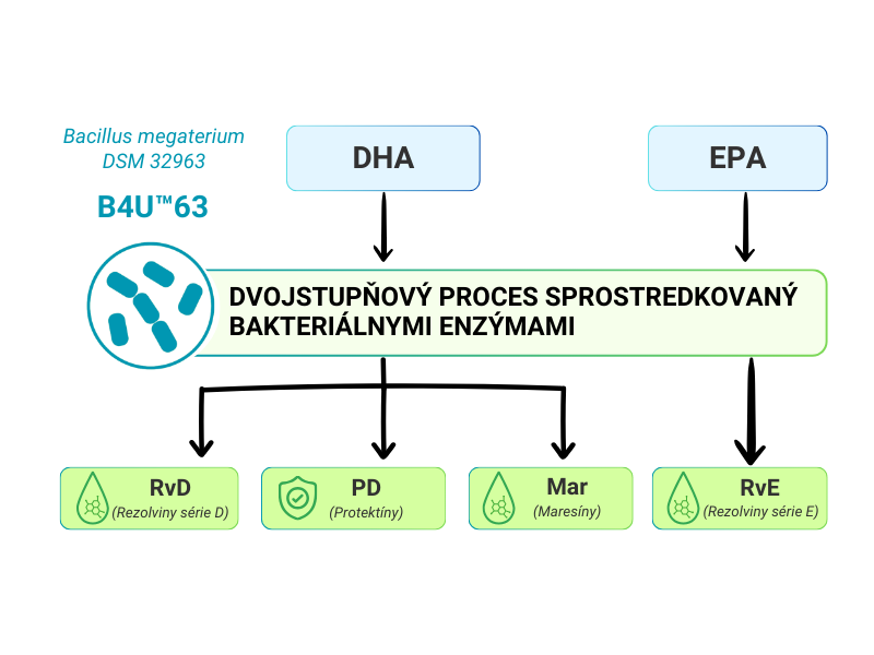 bacillus-megaterium-omega-3-spm-transformacia.png 60.53 KBObrázok 3. Schematicky znázornená transformácia omega-3 (EPA, DHA) na SPM (rezolviny E a D, protektíny, marezíny) pôsobením enzýmov mikroorganizmu Bacillus megaterium DSM 32963 [upravené z materiálov Evonik Industries AG]