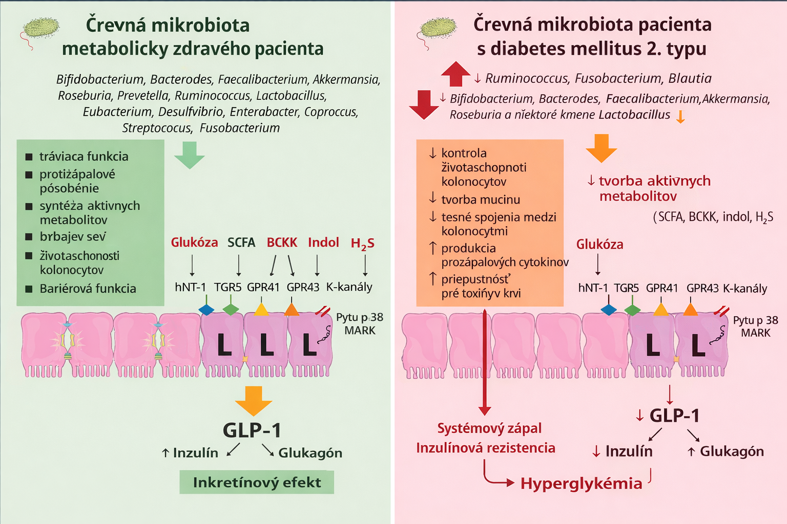 Obrázok 1. Porovnanie vplyvu črevnej mikrobioty na metabolizmus sacharidov u metabolicky zdravého človeka a pacienta s cukrovkou 2. typu [1].