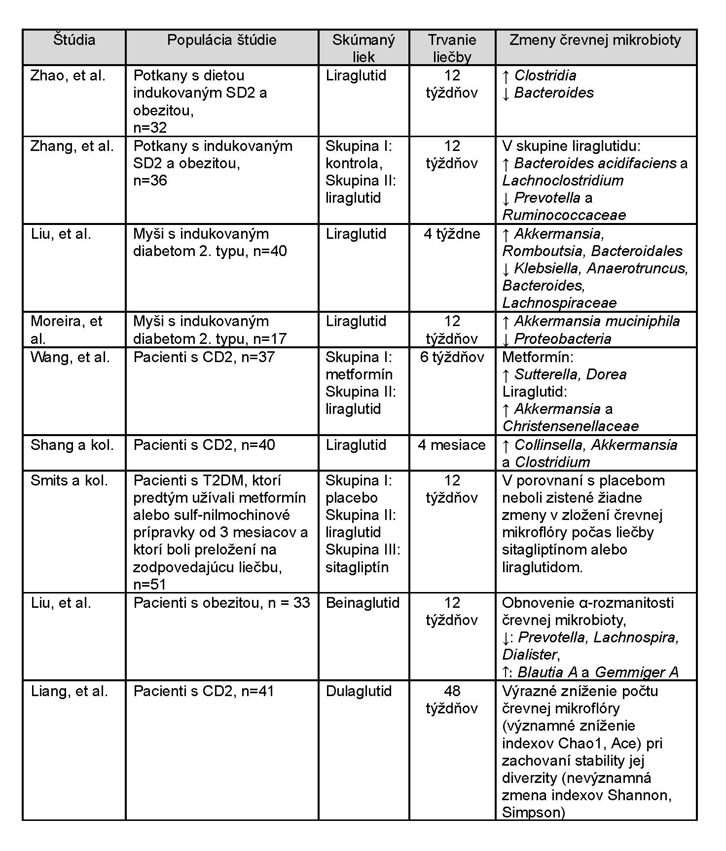 Tabuľka 1. Modulácia črevnej mikrobioty v štúdiách na zvieratách a u pacientov s cukrovkou 2. typu na pozadí použitia analógov GLP-1 [2-10].
