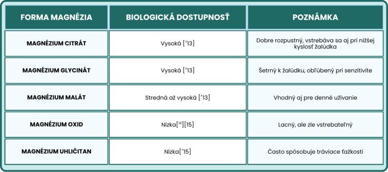 Systematický prehľad v časopise Nutrition (2021) jednoznačne potvrdil: organické soli magnézia (citrát, glycinát, malát) majú výrazne vyššiu biologickú dostupnosť oproti anorganickým formám, akými sú oxid a uhličitan.[^13]
