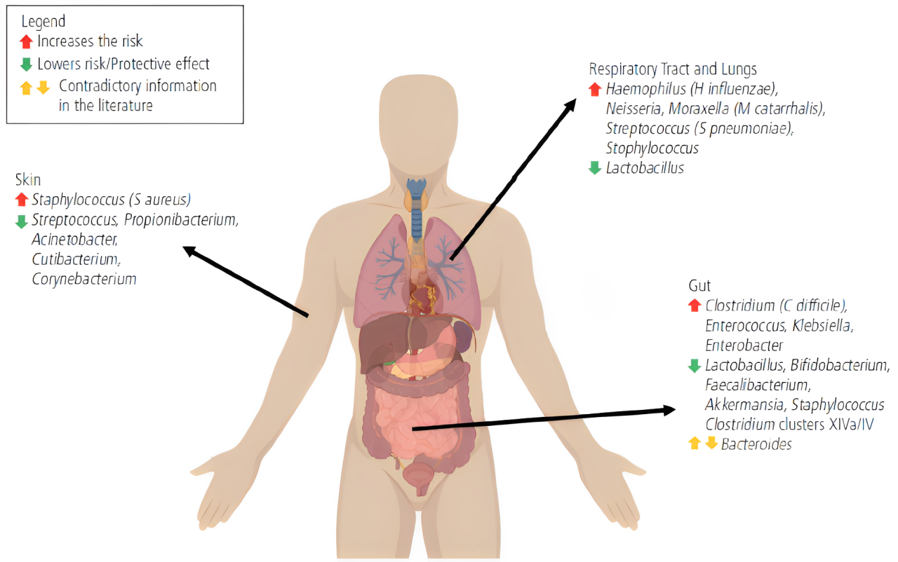 2 (2).png 448.44 KBObrázok 2: Zmeny v mikrobióme sú spojené s rizikom astmy, alergickej nádchy, atopickej dermatitídy a potravinových alergií. Prítomnosť alebo zvýšený výskyt určitých rodov a druhov baktérií sa spája buď so zvýšeným rizikom alergických ochorení (červená šípka smerujúca nahor), alebo s ochranným účinkom proti alergii (zelená šípka smerujúca nadol). Napríklad dysbióza kože so zvýšenou kolonizáciou Staphylococcus aureus je spojená s výskytom atopickej dermatitídy, zatiaľ čo zvýšený počet Cutibacterium a Corynebacterium je dôsledkom liečby a koreluje so zlepšením ekzému. V dýchacích cestách sa zvýšený počet Moraxella catarrhalis, Haemophilus influenzae a Streptococcus pneumoniae spája s výskytom sipotu u dojčiat. V čreve sa prevaha Clostridium difficile nad Bifidobacterium spája s vyšším výskytom potravinovej alergie [1].
