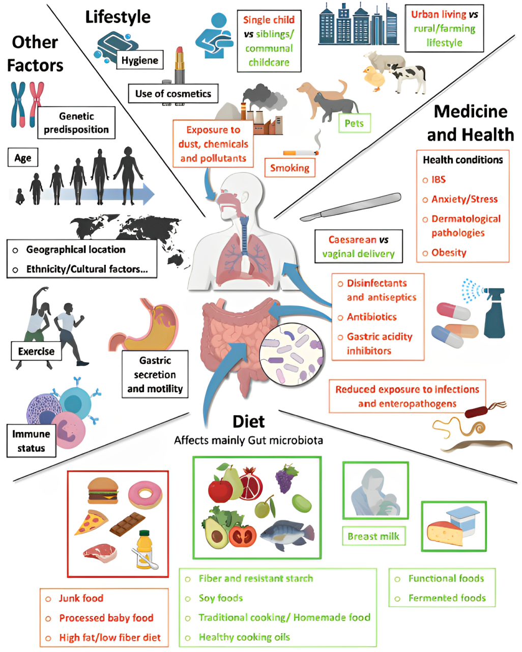 1png (3).png 1.06 MBObrázok 1: Faktory ovplyvňujúce mikroflóru a riziko alergických ochorení. Ukázalo sa, že mnohé faktory ovplyvňujú mikrobiálne populácie obývajúce rôzne oblasti tela. Hlavné faktory na obrázku sú rozdelené do štyroch hlavných skupín: Strava (vrátane všetkého, čo súvisí s príjmom potravy), lieky a zdravie (vrátane spôsobu pôrodu, zdravotného stavu, užívania antibiotík), životný štýl (vrátane vystavenia prachu a chemikáliám, znečistenia, fajčenia, kontaktu so zvieratami) a ostatné faktory (vrátane dedičnosti, veku, etnického pôvodu). Faktory spojené so zvýšeným rizikom alergie sú zvýraznené červenou farbou a faktory s ochranným účinkom proti alergii sú zvýraznené zelenou farbou. Faktory zvýraznené čiernou farbou ovplyvňujú mikrobiotu, ale nemajú jasnú súvislosť s alergickými stavmi [1].